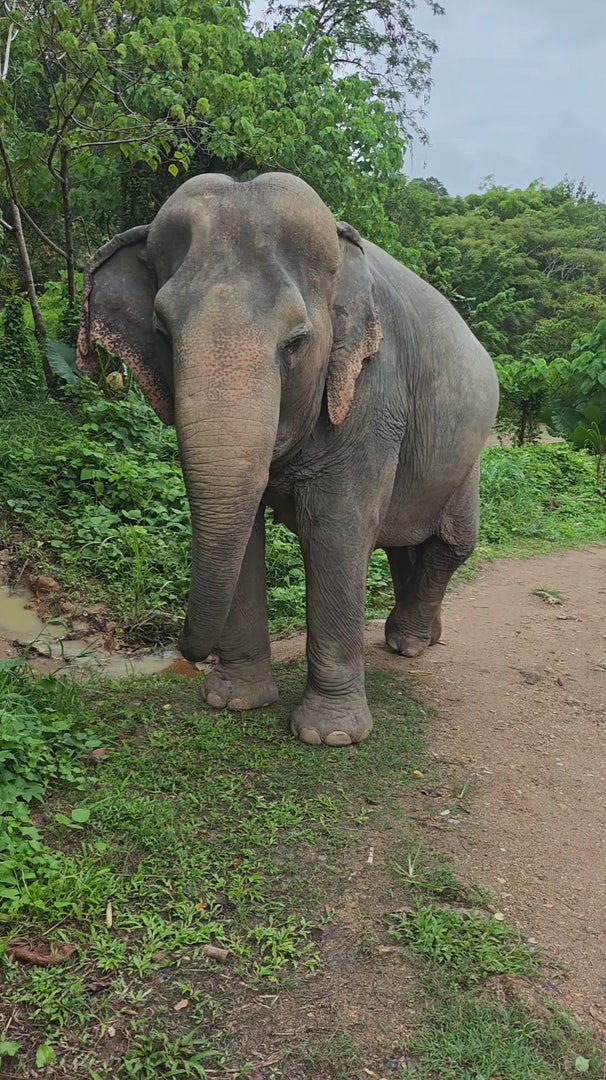 Nam Paerng originated from the Nakhon/Yala region in the south of Thailand where she was a logging elephant for many years, hauling teak and rubber trees out of the forest. She was then sold to a riding camp in Phang Nga before being sold again to Phuket to give rides to tourists before being rescued into sanctuary life with us. Nam Paerng is slow, calm and gentle but loves communicating and has the loudest most incredible roar that we've ever heard, often rumbling and roaring with Gaw Boon near our pond!
